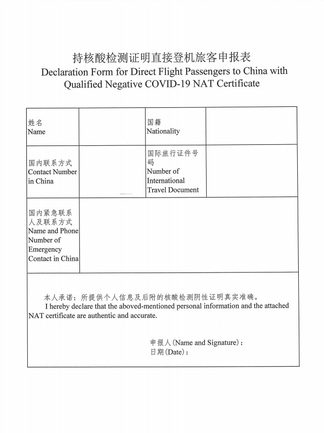 赴华直航航班乘客可持调整后统一格式核酸检测阴性证明和《持核酸检测阴性证明直接登机旅客申报表》直接登机。该表须与有效核酸检测证明一起使用方可登机,可自行在使馆网站下载打印填写,无需使馆审核