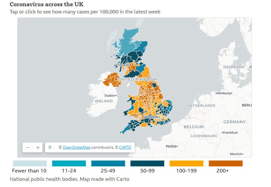英国疫情自从4月的首次高峰以来稳步下降之后,确诊病例从7月开始再次上升,9月和10月的增长率急剧上升。下面地图上的橙色区域是当前每100,000人中病例数最高的区域。