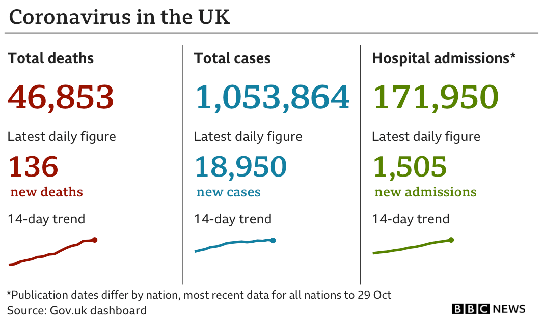 最近几周,整个英国的限制有所收紧。新的为期四周的封锁将从周四开始,来替换当前的三级戒备,直到12月2日。从周一开始,苏格兰已转移到五级病毒警报级别系统。威尔士已经开始实行全国封锁,而北爱尔兰也实行了其他限制。