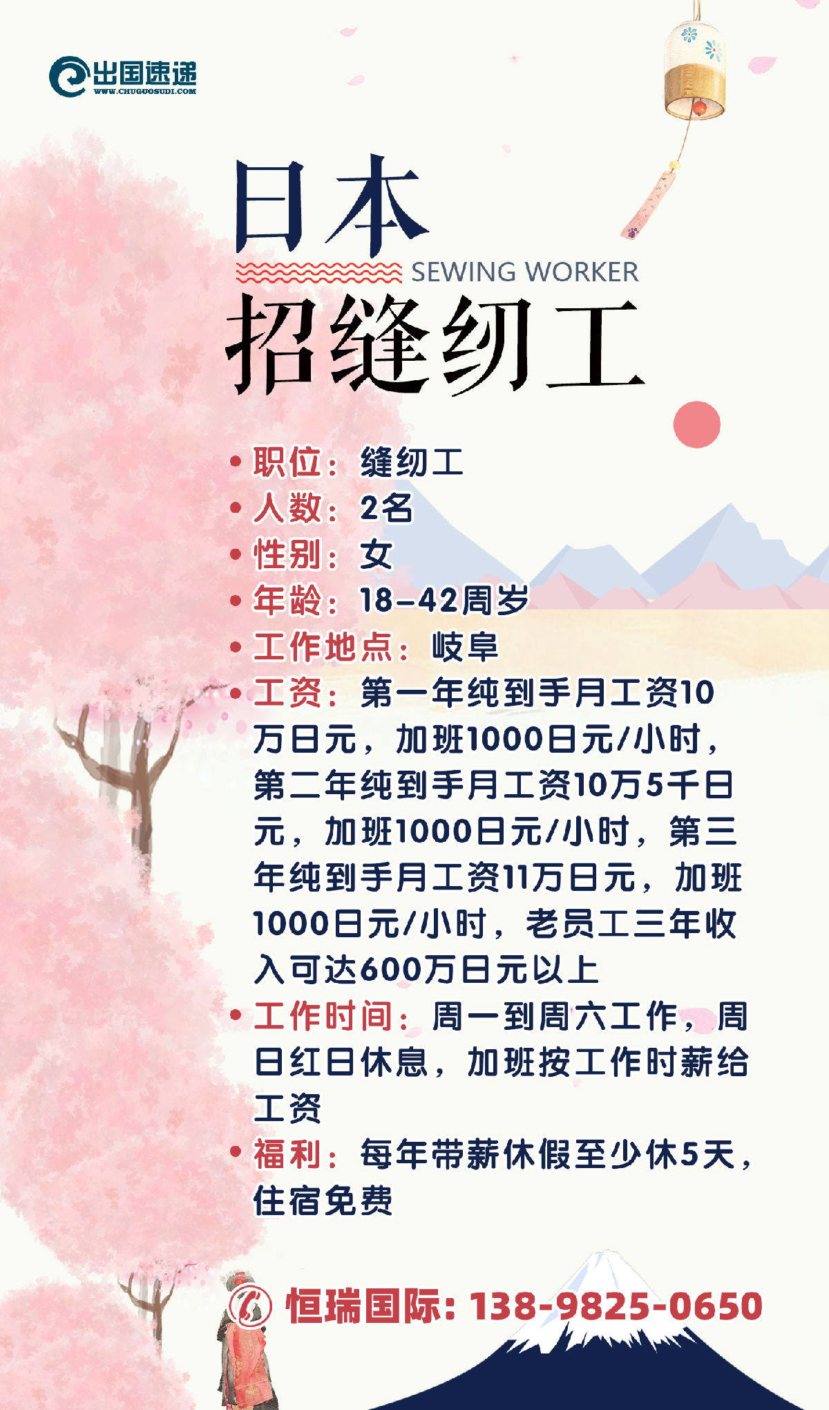 工资:第一年纯到手月工资10万日元,加班1000日元/小时,第二年纯到手月工资10万5千日元,加班1000日元/小时,第三年纯到手月工资11万日元,加班1000日元/小时,老员工三年收入可达600万日元以上