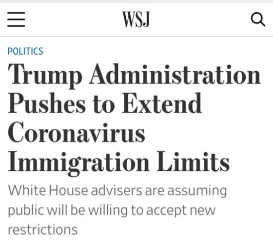 5月8日,美国《华尔街日报》发布了一篇报道:《特朗普政府将推动扩大与新冠疫情相关的移民限制》。文章提到,总统顾问们正在推动实施一项新的移民禁令。