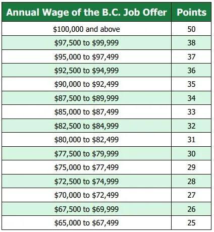 年薪为100000加币及以上的可加满分50分,而年薪低于25000加币的则无加分。