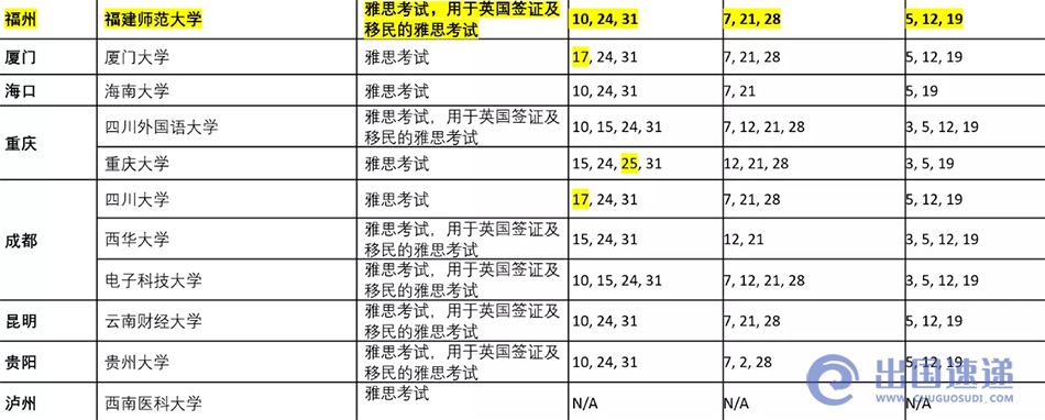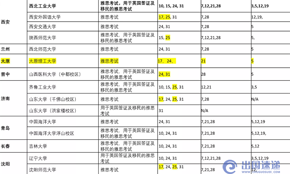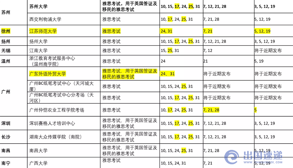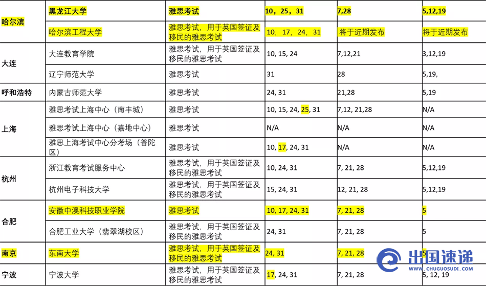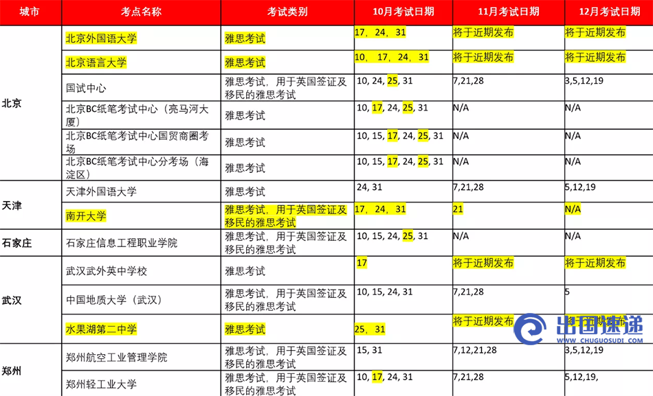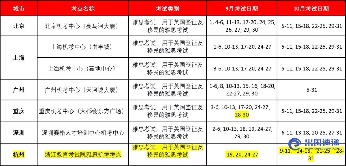 9月和10月雅思考试安排一览表(高亮部分为10月新增恢复考试的考点)
