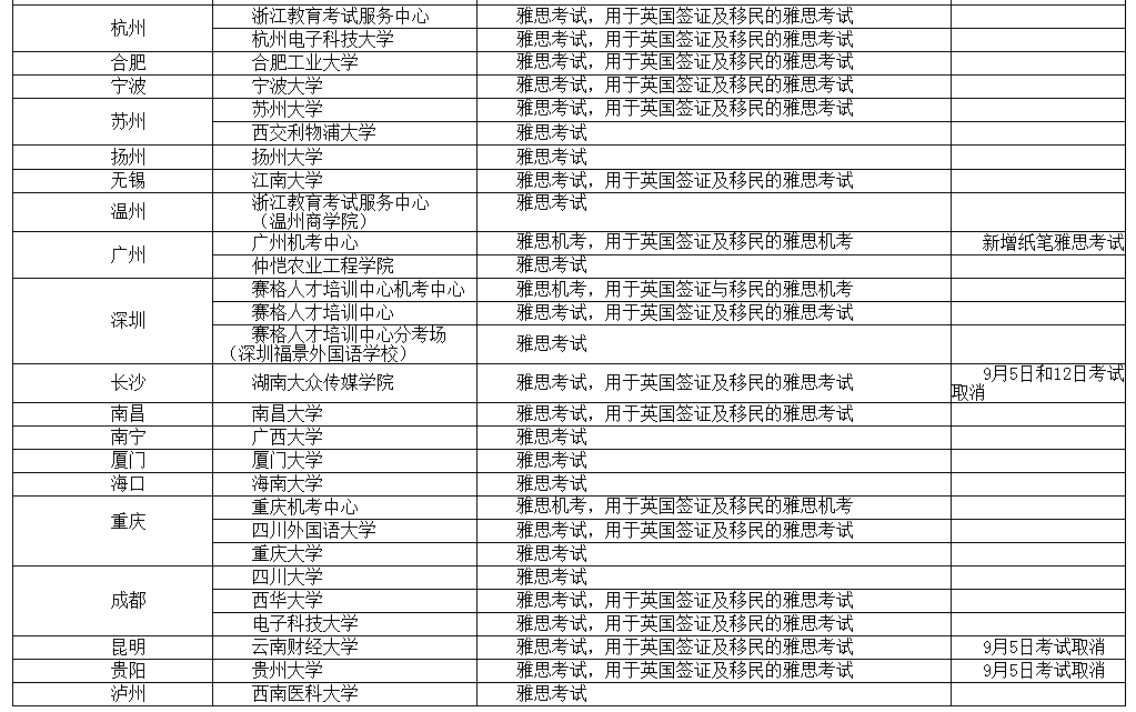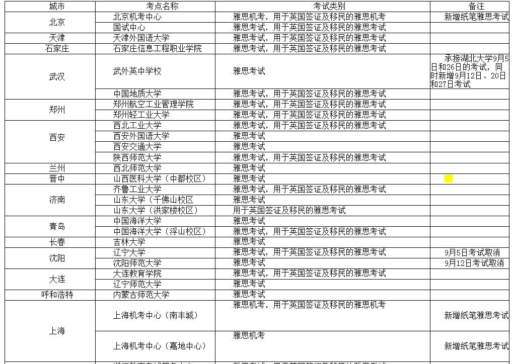 9月份雅思在34个城市开放55个考点,提供各类雅思考试,其他仍不具备考试条件的考点,将继续取消9月份的雅思纸笔考试,除此之外已开放的部分考点也被取消,如9月5日辽宁大学考点、9月12日沈阳师范大学考点等。9月5日和26日湖北大学考点也改为了武汉武外英中学校,同时新增了9月27日的雅思纸笔考试。