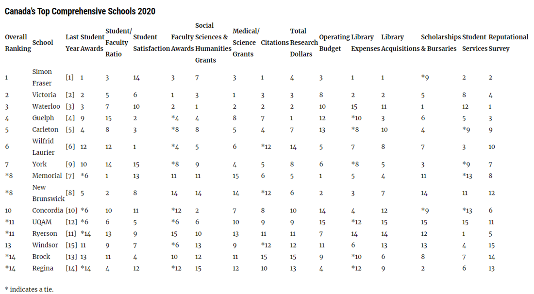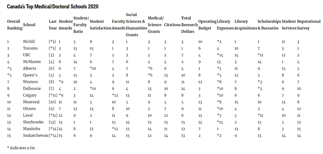 加拿大的本土杂志麦考林杂志(Maclean's)每年都会对加拿大全境的本土大学进行一次排名,这个排行榜是加拿大唯一的一份大学排行榜单。根据科研经费,研究项目的丰富度、深度和广度将加拿大的大学分为以下三类:医博类,综合类,基础类