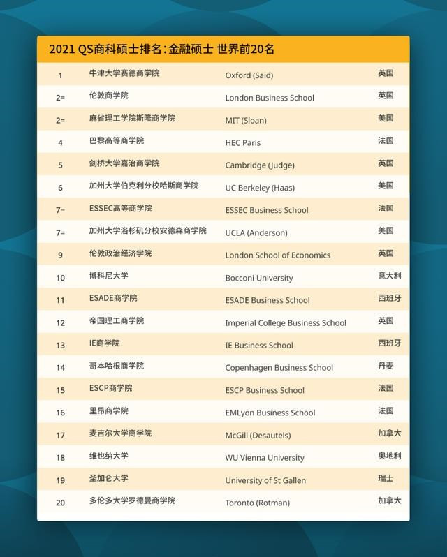 2021QS全球金融硕士排名上榜院校共166所,第一名为牛津大学赛德商学院。