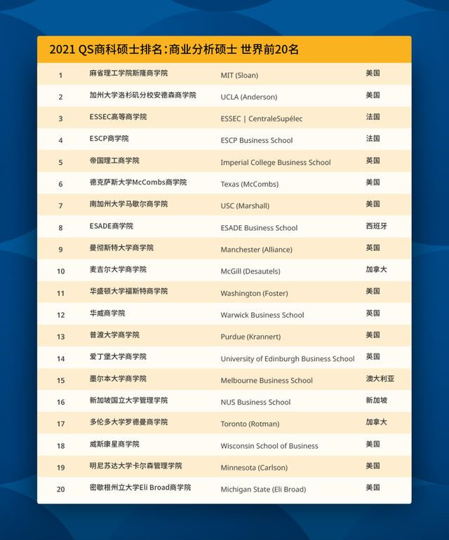2021QS全球商业分析硕士排名上榜院校共97所,第一名为麻省理工学院斯隆商学院。