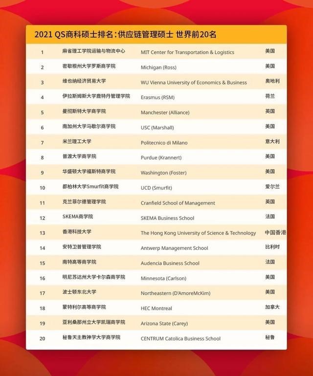 全球共有46所商学院的硕士项目参与了2021QS全球供应链管理硕士排名,其中麻省理工学院MIT的全球供应链管理硕士专业位列世界第一。