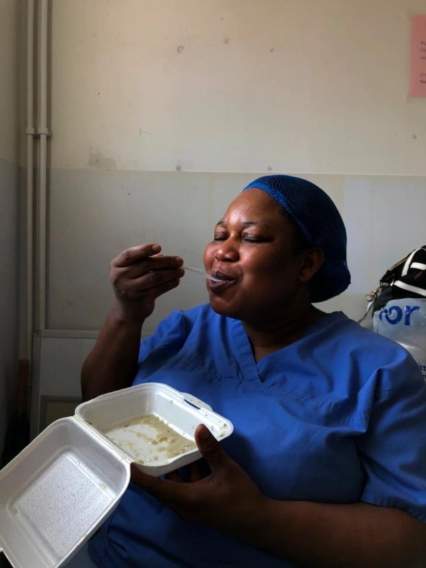 02医院后勤人员在辛苦工作后,正在吃工作餐。