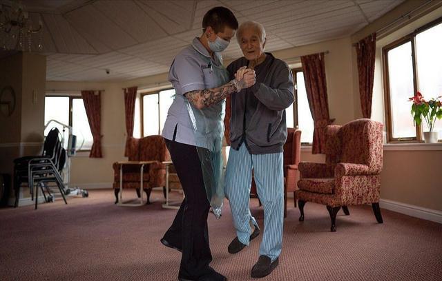09封城期间,在谢菲尔德市,一位护工与79岁老人跳舞解闷。
