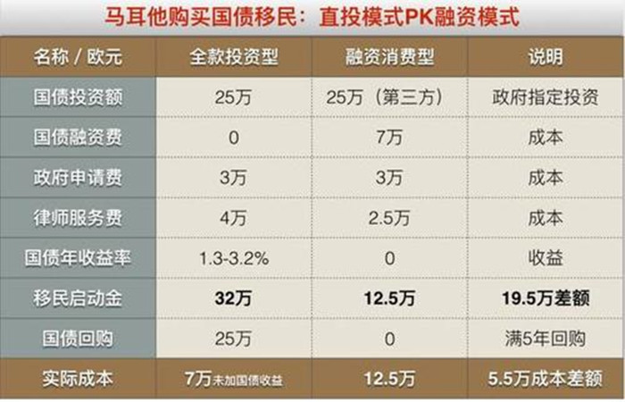 原来投资移民马耳他还是一道数学题,启动资金的差额是19万欧元,直接成本差额是6万欧元,国债保守年均收益率2%就是0.5万欧元,也就是说19万欧元在5年间能赚回6万欧元+2.5万欧元国债收益,共计8.5万欧元的一笔计算,因人而异我们不少客户就是融资债券!