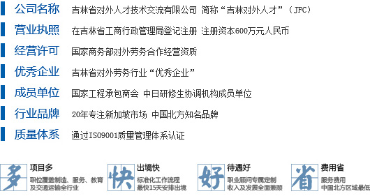 吉林省对外人才技术交流有限责任公司(中文简称"吉林对外人才",英文简称JFC),经中华人民共和国商务部批准,在吉林省工商行政管理局登记注册,具有国家商务部颁发的《对外劳务合作经营许可证》,特许开展对外劳务合作业务。自2005年公司设立以来,连续多年荣获吉林省对外劳务合作行业优秀企业称号,是中国北方地区人力资源行业知名企业。