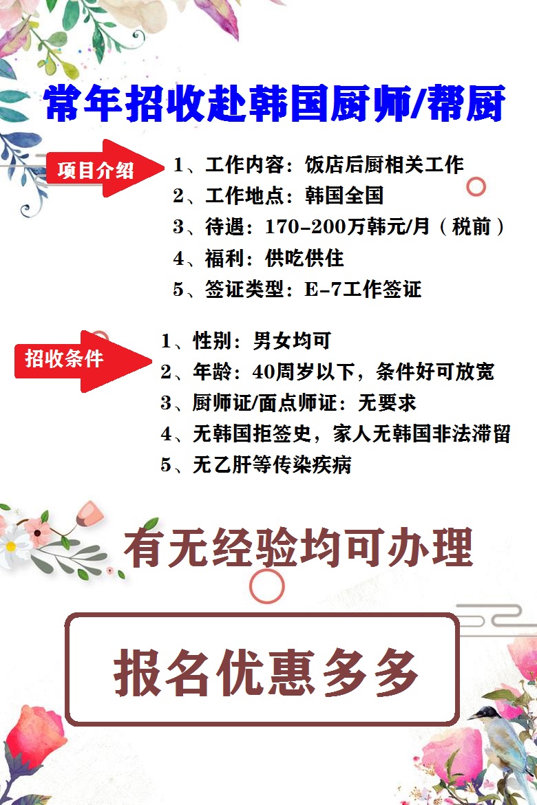 1) 月薪:厨师面点师170~200万韩币月(税前)