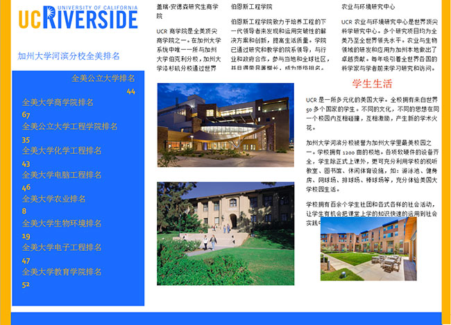 加州大学河滨分校,俗称UCR或UC Riverside。是一所美国著名公立研究型大学,是加州大学系统中十大分校之一。UCR是全美百强名校,公立大学前50强。加州大学河滨分校是加州大学十所分校中发展最快的,并以其人性化著称。加州大学河滨分校治学十分专业和严谨,全校多个学系的研究成果都已达世界级水平。伯恩斯工程学院、工商管理学院以及盖瑞·安德森研究生商学院、文学院、和教育学院都在全美乃至全世界颇有名气。其中本科商学院是加州大学系统中唯一与伯克利分校通过AACSB认证的两所商学院。生物环境以及农学研究更是拥有世界顶尖水平,多次排名全美前三。UCR更是加州大学系统中唯独和洛杉矶分校有医学院的强校。2016年新成立的空气研究所也吸引了世界各地的空气气候研究专家。UCR一直秉承兼收并蓄、自由开放的方针,容天下贤士于一堂,从而把大学建成为世界一流大学素以学术自由和学生自治著称。在这里没有来自保守传统的约束,没有不可逾越的清规戒律。在这片自由的土地上,可以畅想一切,自由地探索未来世界;在这里,即使别人并不同意你的观点,但你的思想永远会受到尊重。正是缘于这种自由思想,才使无数伟大的思想和发现在这里得以孕育和成熟。才使无数伟大的思想和发现在这里得以孕育和成熟。